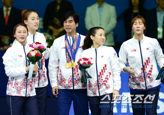 여자 펜싱 플러레 단체전에서 한국팀(오하나, 김미나, 전희숙, 남현희)이 아시안게임 5연패를 달성했다. 인천 아시안게임 펜싱 여자 플러레 단체전 한국과 중국의 결승전 경기가 24일 오후 경기도 고양실내체육관에서 열렸다. 중국을 꺾고 금메달을 딴 선수들이 금메달을 최명진 코치에게 걸어주고 있다.
