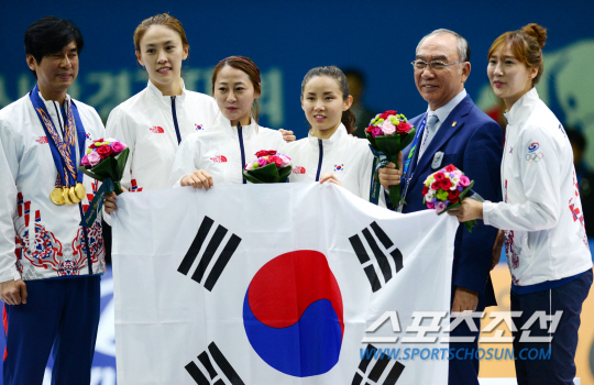 여자 펜싱 플러레 단체전에서 한국팀(오하나, 김미나, 전희숙, 남현희)이 아시안게임 5연패를 달성했다. 인천 아시안게임 펜싱 여자 플러레 단체전 한국과 중국의 결승전 경기가 24일 오후 경기도 고양실내체육관에서 열렸다. 중국을 꺾고 금메달을 딴 선수들이 최명진 코치, 손길승 펜싱협회장과 함께 기념촬영을 하고 있다.