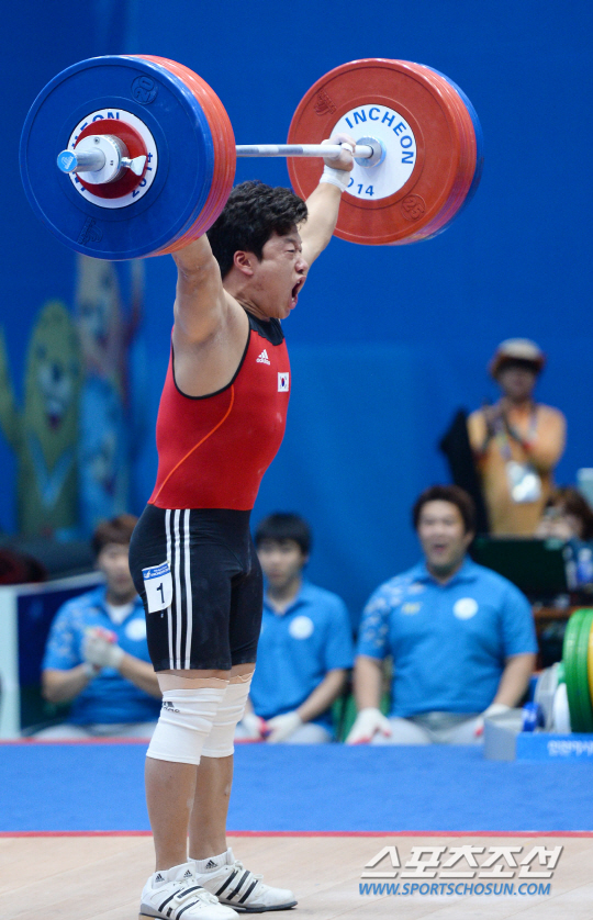 한국역도대표팀 사재혁이 24일 인천 송도 달빛축제공원 역도경기장에서 열린 2014인천아시안게임 남자역도 85kg급에 출전해 인상 2차시기에서 171kg을 들어올리고 있다. 인천=최문영 기자 deer@sportschosun.com /2014.09.24/