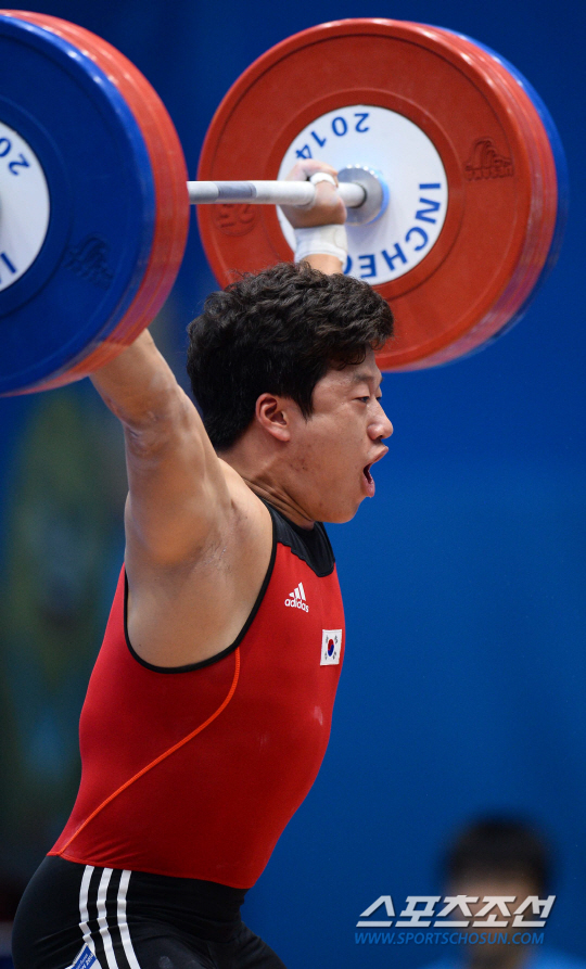 한국역도대표팀 사재혁이 24일 인천 송도 달빛축제공원 역도경기장에서 열린 2014인천아시안게임 남자역도 85kg급에 출전해 인상 2차시기에서 171kg을 들어올리고 있다. 인천=최문영 기자 deer@sportschosun.com /2014.09.24/