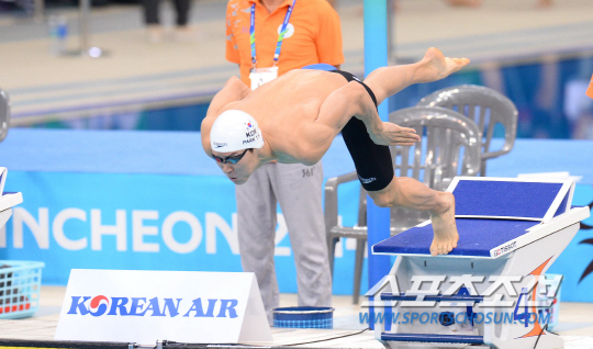 한국수영대표팀 박태환이 25일 인천 문학박태환수영장에서 열린 2014인천아시안게임 남자 수영 자유영 100m 예선전에 출전해 역영을 펼치고 있다.