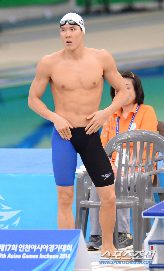 한국수영대표팀 박태환이 25일 인천 문학박태환수영장에서 열린 2014인천아시안게임 남자 수영 자유영 100m 예선전에 출전해 준비운동을 하고 있다.