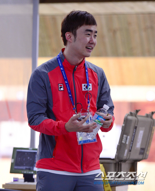 25일 오후 인천 옥련국제사격장에서 2014 인천 아시안게임 사격 남자 50M 소총복사 본선 경기가 열렸다. 은메달을 차지한 한국의 김준홍이 환하게 웃고 있다.