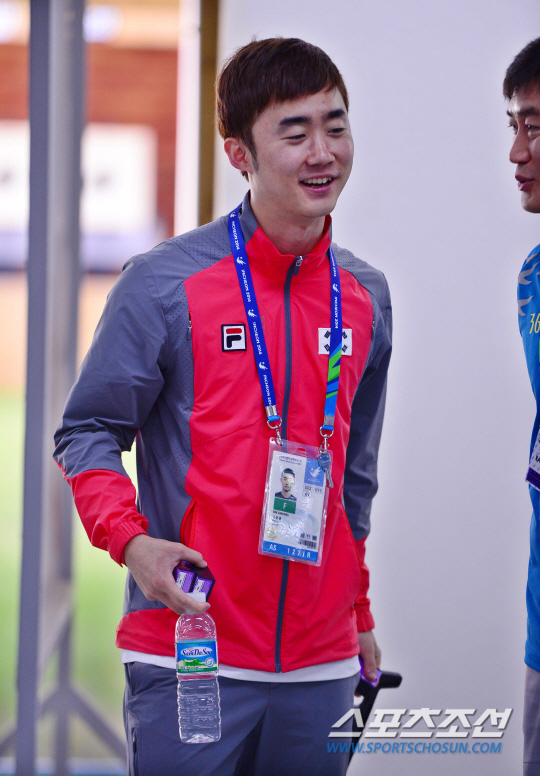 25일 오후 인천 옥련국제사격장에서 2014 인천 아시안게임 사격 남자 50M 소총복사 본선 경기가 열렸다. 은메달을 차지한 한국의 김준홍이 환하게 웃고 있다.