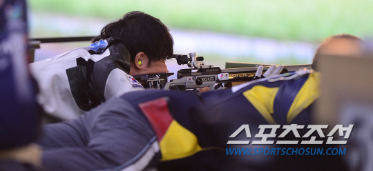 25일 오후 인천 옥련국제사격장에서 2014 인천 아시안게임 사격 남자 50M 소총복사 본선 경기가 열렸다. 단체전 은메달을 차지한 한국의 유재진이 사격을 하고 있다.