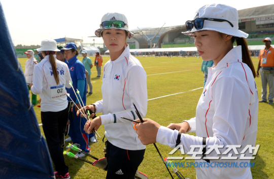 2014 인천아시안게임 양궁 컴파운드 여자단체 8강전 경기가 25일 인천 계양아시아드양궁장에서 열렸다. 최보민과 김윤희가 과녁에 명중한 활을 확인하고 있다.