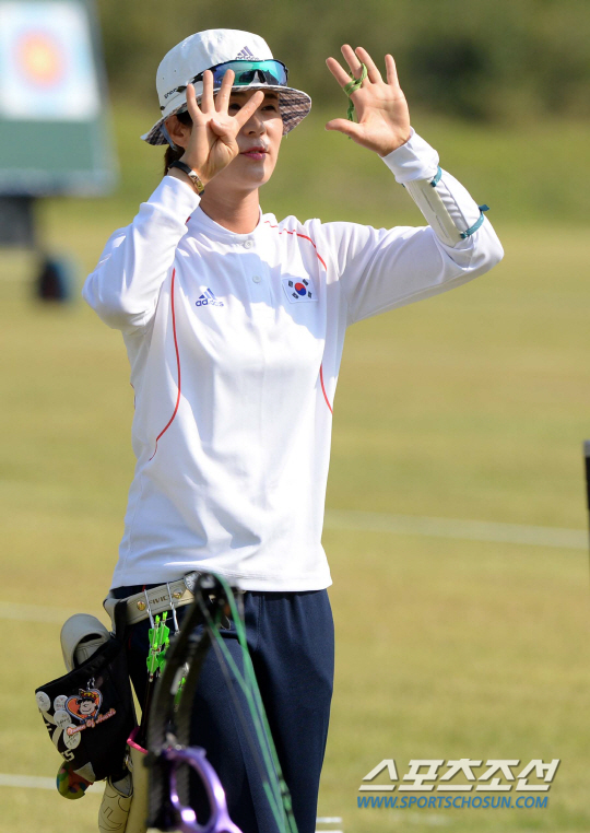 2014 인천아시안게임 양궁 컴파운드 여자단체 8강전 경기가 25일 인천 계양아시아드양궁장에서 열렸다. 최보민이 과녁에 명중한 활을 확인한 후 코칭스탭에 손짓으로 이야기를 하고 있다.