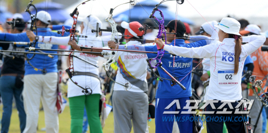 2014 인천아시안게임 양궁 컴파운드 여자단체 8강전 경기가 25일 인천 계양아시아드양궁장에서 열렸다. 석지현이 활 시위를 당기고 있다. 양궁 컴파운드 여자단체전에는 석지현, 최보민, 김윤희가 출전했다.