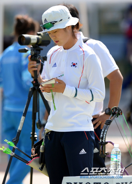 2014 인천아시안게임 양궁 컴파운드 여자개인 32강전 경기가 25일 인천 계양아시아드양궁장에서 열렸다. 최보민이 경기 중 진지한 표정으로 기록을 하고 있다