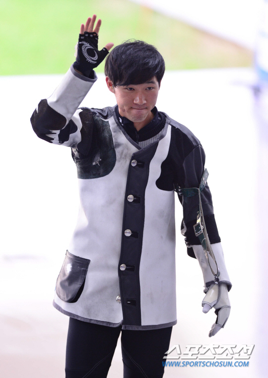 25일 오후 인천 옥련국제사격장에서 2014 인천 아시안게임 사격 남자 50M 소총복사 결선 경기가 열렸다. 개인전 결선에서 탈락한 한국의 유재진이 관중들에게 인사하고 있다.