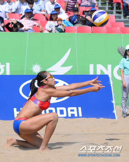 한국비치발리볼 대표팀 이은아가 25일 송도글로벌대학 비치발리볼 경기장에서 열린 2014인천아시안게임 여자 예선 16강전에서 타지키스탄의 공격을 리시브 하고 있다.