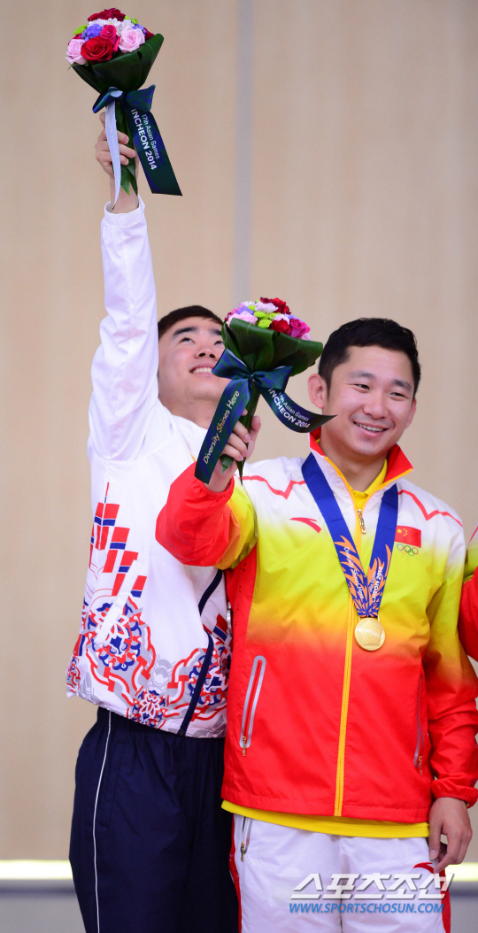 25일 오후 인천 옥련국제사격장에서 2014 인천 아시안게임 사격 남자 25M 스탠다드 권총 단체전 시상식이 열렸다. 시상식에서 은메달을 획득한 한국 김준홍이 중국 선수와 장난치고 있다.