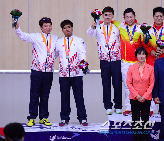 25일 오후 인천 옥련국제사격장에서 2014 인천 아시안게임 사격 남자 25M 스탠다드 권총 단체전 시상식이 열렸다. 시상식에서 은메달을 획득한 한국 김준홍(왼쪽에서 세 번째)이 금메달 단상 위에서 포즈를 취하고 있다.