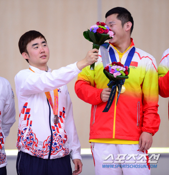 25일 오후 인천 옥련국제사격장에서 2014 인천 아시안게임 사격 남자 25M 스탠다드 권총 단체전 시상식이 열렸다. 시상식에서 은메달을 획득한 한국 김준홍이 중국 선수와 장난치고 있다.