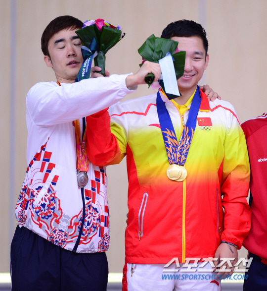 25일 오후 인천 옥련국제사격장에서 2014 인천 아시안게임 사격 남자 25M 스탠다드 권총 개인전 시상식이 열렸다. 시상식에서 은메달을 획득한 한국 김준홍이 중국 딩펑과 장난치고 있다.