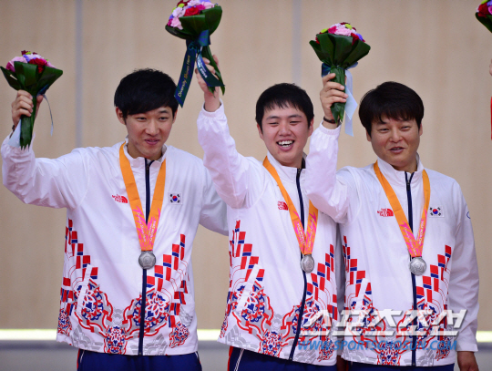 25일 오후 인천 옥련국제사격장에서 2014 인천 아시안게임 사격 남자 50M 소총 복사 단체전 시상식이 열렸다. 시상식에서 은메달을 획득한 한국 선수들이 포즈를 취하고 있다.