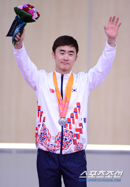25일 오후 인천 옥련국제사격장에서 2014 인천 아시안게임 사격 남자 25M 스탠다드 권총 개인전 시상식이 열렸다. 시상식에서 은메달을 획득한 한국 김준홍이 포즈를 취하고 있다.