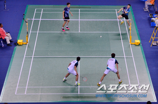 25일 오후 인천 계양체육관에서 2014 인천 아시안게임 배드민턴 남자 복식 16강전 한국과 홍콩의 경기가 열렸다. 한국 유연성이 홍콩 진영을 향해 강한 스메싱 공격을 시도하고 있다. 왼쪽은 유연성