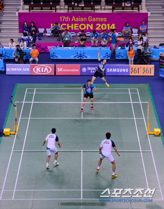 25일 오후 인천 계양체육관에서 2014 인천 아시안게임 배드민턴 남자 복식 16강전 한국과 홍콩의 경기가 열렸다. 한국 유연성이 홍콩 진영을 향해 강한 스메싱 공격을 시도하고 있다. 왼쪽은 유연성