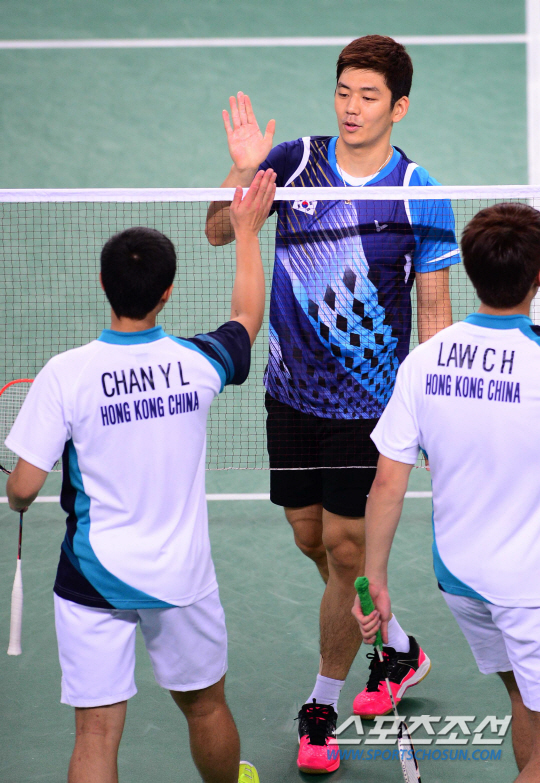 25일 오후 인천 계양체육관에서 2014 인천 아시안게임 배드민턴 남자 복식 16강전 한국과 홍콩의 경기가 열렸다. 경기에 승리한 한국 이용대가 홍콩 선수들과 하이파이브를 나누고 있다.