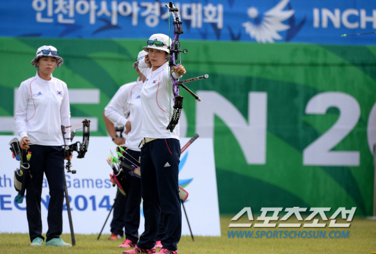 여자양궁 컴파운드 단체전에 출전한 대표팀 최보민, 김윤희, 석지현이 결승에 진출했다. 25일 인천 계양아시아드양궁장에서 열린 2014 인천 아시안게임 여자양궁 컴파운드 단체전 4강전 이란과의 경기에서 최보민이 활시위를 당기고 있다.