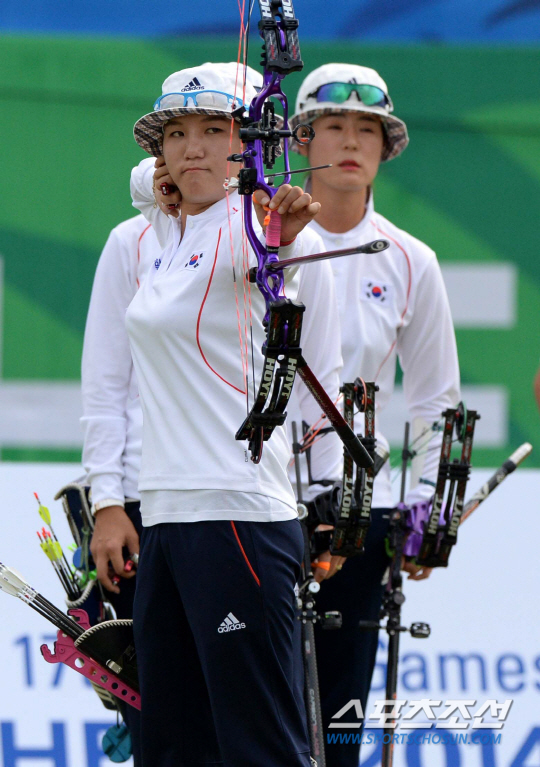 여자양궁 컴파운드 단체전에 출전한 대표팀 최보민, 김윤희, 석지현이 결승에 진출했다. 25일 인천 계양아시아드양궁장에서 열린 2014 인천 아시안게임 여자양궁 컴파운드 단체전 4강전 이란과의 경기에서 석지현이 활시위를 당기고 있다.