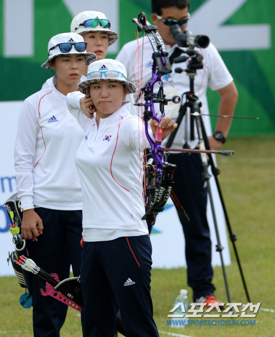여자양궁 컴파운드 단체전에 출전한 대표팀 최보민, 김윤희, 석지현이 결승에 진출했다. 25일 인천 계양아시아드양궁장에서 열린 2014 인천 아시안게임 여자양궁 컴파운드 단체전 4강전 이란과의 경기에서 석지현이 활시위를 당기고 있다.