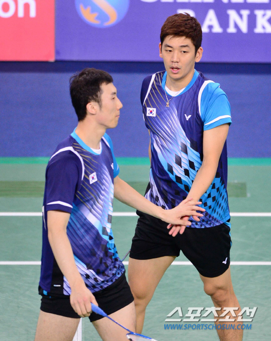 25일 오후 인천 계양체육관에서 2014 인천 아시안게임 배드민턴 남자 복식 16강전 한국과 홍콩의 경기가 열렸다. 득점에 성공한 한국 이용대가 유연성과 환호하고 있다.