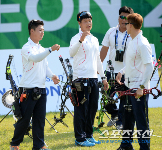 남자양궁 컴파운드 단체전에 출전한 대표팀 민지홍 최용희 양영호가 결승에 진출했다. 25일 인천 계양아시아드양궁장에서 열린 2014 인천 아시안게임 남자양궁 컴파운드 단체전 4강전 필리핀과의 경기에서 선수들이 승리를 확정지은 후 기쁨을 나누고 있다.
