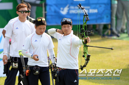 남자양궁 컴파운드 단체전에 출전한 대표팀 민리홍 최용희 양영호가 결승에 진출했다. 25일 인천 계양아시아드양궁장에서 열린 2014 인천 아시안게임 남자양궁 컴파운드 단체전 4강전 필리핀과의 경기에서 민리홍이 활시위를 당기고 있다.