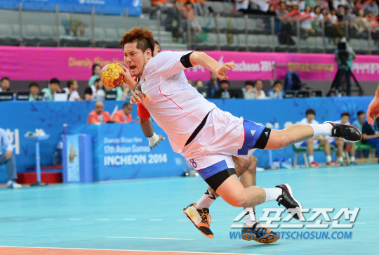 한국핸드볼대표팀 박준규가 25일 인천 선학체육관에서 열린 2014인천아시안게임 남자핸드볼 본선에서 이란의 수비사이로 슛을 날리고 있다.