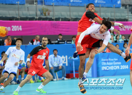 한국핸드볼대표팀 정이경이 25일 인천 선학체육관에서 열린 2014인천아시안게임 남자핸드볼 본선에서 이란의 골키퍼의 수비사이로 슛을 날리고 있다.