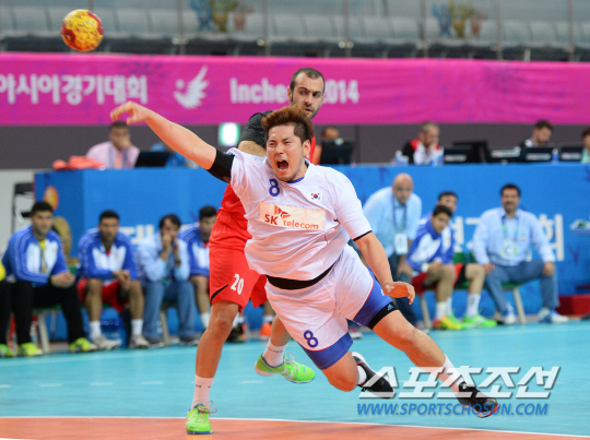 한국핸드볼대표팀 박준규가 25일 인천 선학체육관에서 열린 2014인천아시안게임 남자핸드볼 본선에서 이란의 골키퍼의 수비사이로 슛을 날리고 있다.