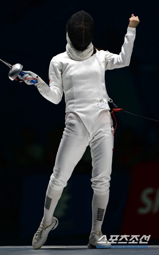 한국 여자 펜싱대표팀이 2014 인천아시안게임 펜싱 여자 에페 단체전 결승에 출전했다. 24일 고양체육관에서 열린 펜싱 여자 에페 단체전 결승, 한국과 중국의 경기에서 신아람이 공격을 성공한 후 환호하고 있다. 펜싱 여자대표팀은 신아람, 최인정, 최은숙, 김명선으로 구성돼있다.
