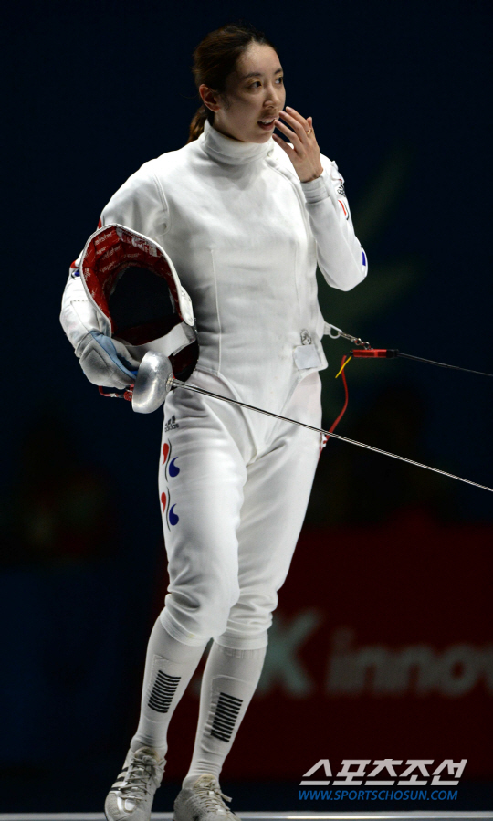 한국 여자 펜싱대표팀(신아람, 최인정, 최은숙, 김명선)이 2014 인천아시안게임 펜싱 여자 에페 단체전 결승에 출전했으나 아쉽게도 금메달 사냥엔 실패했다. 24일 고양체육관에서 열린 펜싱 여자 에페 단체전 결승, 한국과 중국의 경기에서 신아람이 경기를 마친 후 아쉬워하고 있다.