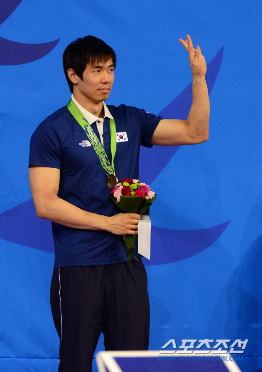 25일 인천 문학박태환수영장에서 2014인천아시아경기대회 남자 접영 50m 결승전에서 양정두가 동메달을 획득했다. 시상식에서 동메달을 받고 손을 들어보이고 있는 양정두.