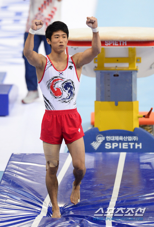 한국체조대표팀 양학선이 25일 인천 남동체육관에서 열린 2014인천아시안게임 남자기계체조 도마결승에서 고난이도 연기를 성공시킨후 환호하고 있다.