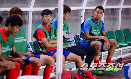 25일 오후 경기도 고양시 고양종합운동장에서 2014 인천 아시안게임 남자 축구 한국과 홍콩의 경기가 열렸다. 김신욱이 벤치에서 경기를 기다리고 있다.