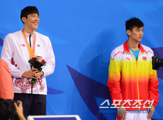 25일 인천 문학박태환수영장에서 2014인천아시아경기대회 남자 수영 100m 결승전 경기가 열렸다. 예선 전체 1위로 통과한 박태환은 4번 레인을 배정받았고, 예선에서 2위에 오른 일본의 하라다 라마루가 5번 레인, 아시아 기록 보유자인 중국 닝 저타오가 3번 레인에서 경기를 펼쳤다. 박태환이 48초75를 기록해 2위를 차지했다. 중국의 밍 저타오가 47초70으로 금메달을 목에 걸었다. 시상식에서 은메달을 목에 건 박태환이 팬들에게 미소를 보내고 있다.