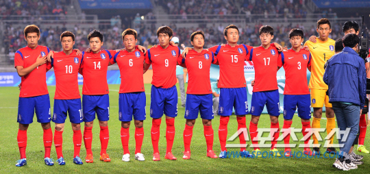 25일 오후 경기도 고양시 고양종합운동장에서 2014 인천 아시안게임 남자 축구 한국과 홍콩의 경기가 열렸다. 한국 선수들이 어깨동무를 한 채 애국가를 부르고 있다.