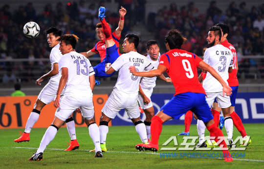 25일 오후 경기도 고양시 고양종합운동장에서 2014 인천 아시안게임 남자 축구 한국과 홍콩의 경기가 열렸다. 한국 임창우가 홍콩 골문을 향해 슈팅을 시도하고 있다.