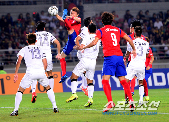 25일 오후 경기도 고양시 고양종합운동장에서 2014 인천 아시안게임 남자 축구 한국과 홍콩의 경기가 열렸다. 한국 임창우가 홍콩 골문을 향해 슈팅을 시도하고 있다.