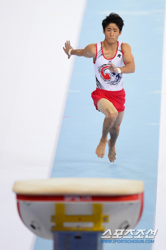한국체조대표팀 양학선이 25일 인천 남동체육관에서 열린 2014인천아시안게임 남자기계체조 도마결승에서 자신의 이름을 딴 '양학선2' 연기를 시도하고 있다.