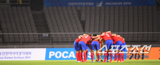 25일 오후 경기도 고양시 고양종합운동장에서 2014 인천 아시안게임 남자 축구 한국과 홍콩의 경기가 열렸다. 한국 선수들이 경기 전 한데 모여 선전을 다짐하고 있다. 텅 빈 관중석이 눈에 띈다.