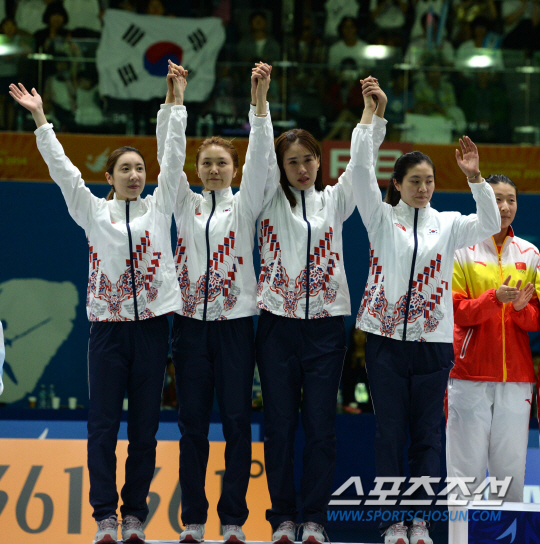 한국 여자 펜싱대표팀(신아람, 최인정, 최은숙, 김명선)이 2014 인천아시안게임 펜싱 여자 에페 단체전 결승에 출전해 은메달을 획득했다. 24일 고양체육관에서 열린 펜싱 여자 에페 단체전 결승경기 후 진행된 시상식에서 선수들이 시상대에 오르고 있다.