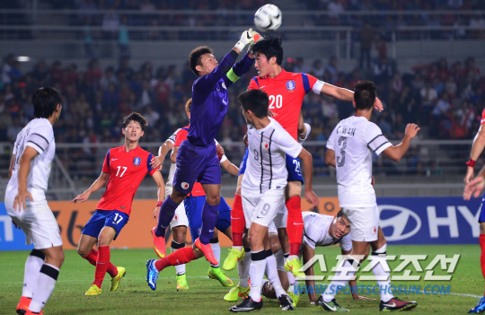 25일 오후 경기도 고양시 고양종합운동장에서 2014 인천 아시안게임 남자 축구 한국과 홍콩의 경기가 열렸다. 장현수가 헤딩슛을 시도하고 있다.
