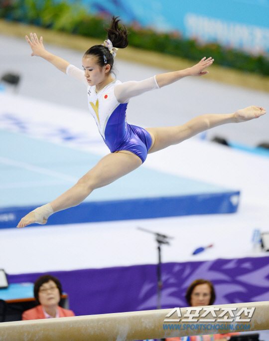 일본체조대표팀 혼다 미나미가 25일 인천 남동체육관에서 열린 2014인천아시안게임 여자기계체조 평균대 결승에서 화려한 회전연기를 선보이고 있다.
