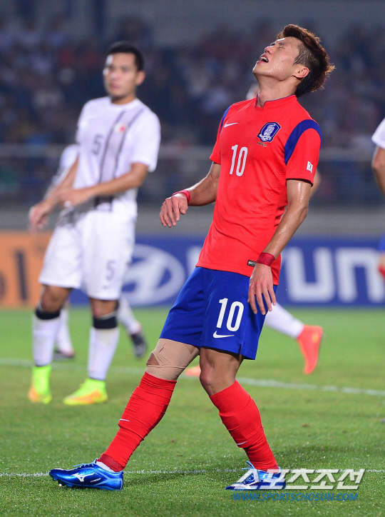 25일 오후 경기도 고양시 고양종합운동장에서 2014 인천 아시안게임 남자 축구 한국과 홍콩의 경기가 열렸다. 김승대가 슈팅이 골문을 벗어나자 아쉬워하고 있다.