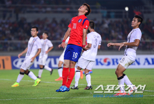 25일 오후 경기도 고양시 고양종합운동장에서 2014 인천 아시안게임 남자 축구 한국과 홍콩의 경기가 열렸다. 김승대가 슈팅이 골문을 벗어나자 아쉬워하고 있다.