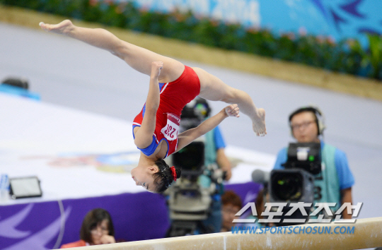 북한체조대표팀 김소영이 25일 인천 남동체육관에서 열린 2014인천아시안게임 여자기계체조 평균대 결승에서 화려한 회전연기를 선보이고 있다.